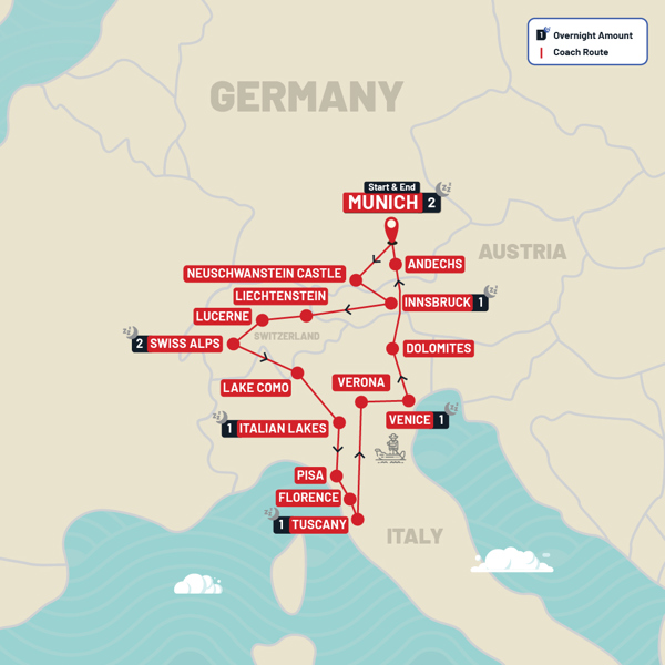 Many tours start and end in the same place, but you can also join a one way tour of Europe. For example starting in London and ending in Rome or vice versa. Should you require an additional visa for entering the UK, you always have the option to miss the early start from London and join at the tour hotel in Paris in the late afternoon instead.
