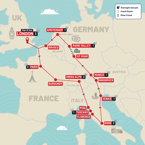 Tick off Europe’s top destinations on this Europe Christmas & New Year tour. See London's sights and cruise the Rhine River in Germany and Amsterdam's canals. Capture famous landmarks s