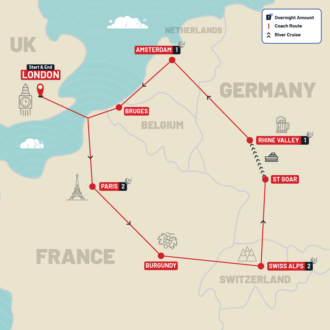 Embark on an unforgettable European adventure and immerse yourself in the historic culture, food, and sights of Europe. Tick off six iconic destinations — UK, France, Switzerland, Germany, Netherla