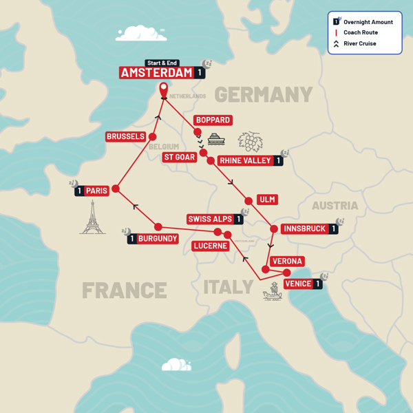 Embark on this Classic Europe tour and explore top European destinations! Cruise Amsterdam’s canals, and Germany’s Rhine River. Capture iconic sites like London’s Buckingham Palace, Italy’s Leaning