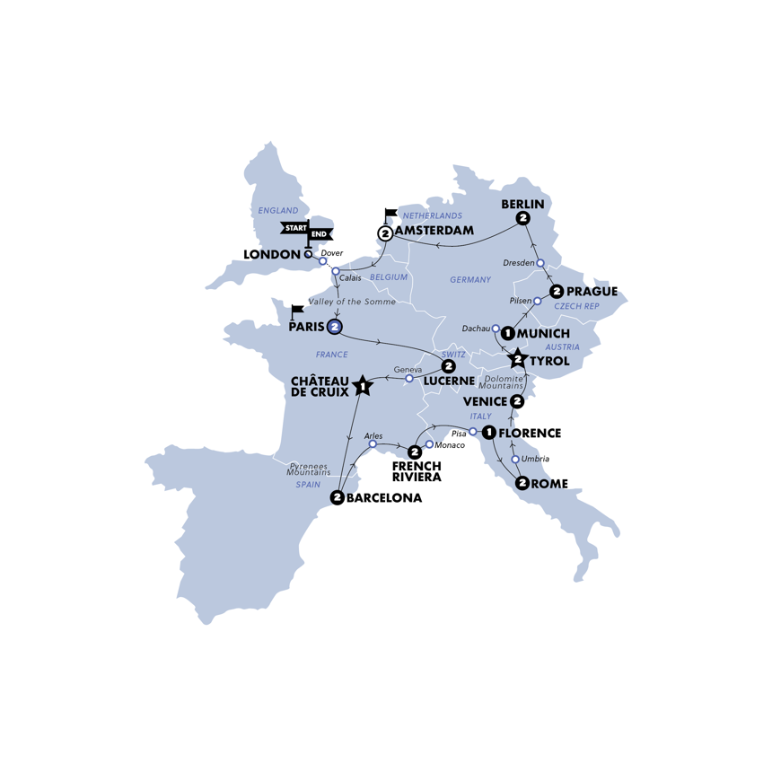 Wanna go all in on Europe’s major cities? We’re talking Amsterdam, Paris, Berlin, Prague, Venice, Rome… and even Barcelona! On this extraordinary European Escapade tour, you’ll make the most of one iconic continent, with stop-offs at the Swiss Alps and exclusive Special Stays in Hopfgarten and at Contiki's Château de Cruix.
