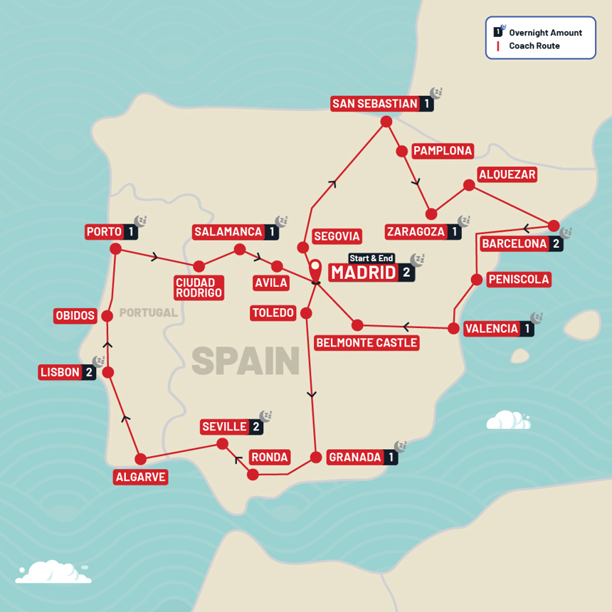 Experience the Iberian spirit on a tour that seamlessly connects two epic European countries - Spain and Portugal! Explore vibrant cities like Madrid, Barcelona, and Seville. Travel off-the-beaten-path and explore Alquézar, Peñíscola, and Segovia. Marvel at UNESCO sites and charming towns, savour tapas and local Port wines. Visit the buzzing city of Lisbon and marvel at Porto’s scenic sights. Discover the serene southern European lifestyle under the sun on this unforgettable Spain & Portugal tour!