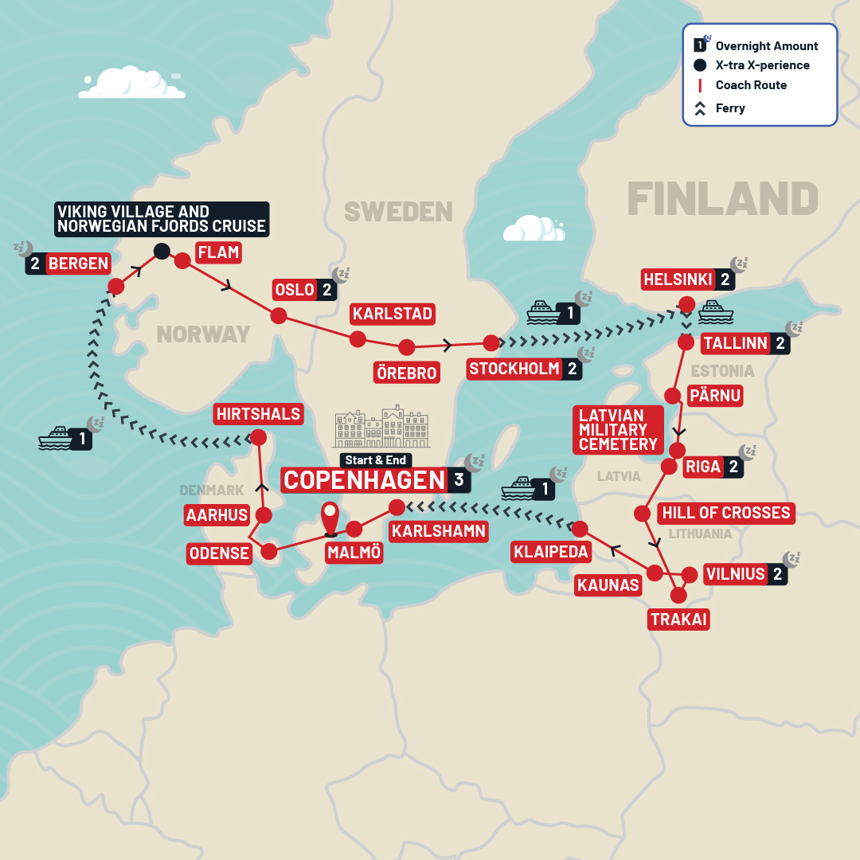 Experience more on this picturesque tour! Admire Scandinavia and explore the highlights of Baltic travel over 21 days. Begin this immersive journey in the Danish capital, board a ferry to Norway, capture Sweden's captivating history and soak up the fabulous natural scenery in Finland. Discover the Baltics at its best! Explore the capital cities of Estonia and Latvia and marvel at the top attractions in Lithuania. From hidden gems and natural splendour to historical sites and more time to explore them, this is an unmissable Scandinavia and Baltic tour!