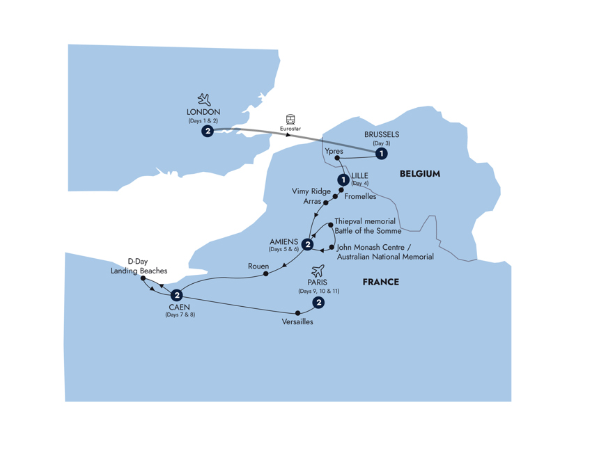 Your Europe battlefield tour is the ultimate in-depth journey into the history of World Wars I and II. Journey to the Ypres Salient battlefields and see the Passchendaele Memorial and Tyne Cot Commonwealth War Graves Cemetery. Visit the Australian Fromelles Military Cemetery, where 250 British and Australian soldiers were buried and learn insights from a Local Expert for a tour of the key battlefields of the Somme. In Normandy, stand on the 100-foot-tall Pointe du Hoc overlooking the D-Day Landing Beaches and be guided through the Normandy American Cemetery at Omaha Beach. Indulge in a MAKE TRAVEL MATTER®️ Experience at Les Confisseurs confectionary. End the trip exploring Paris' celebrated squares and avenues, from Place de la Concorde to the Champs-Élysées.