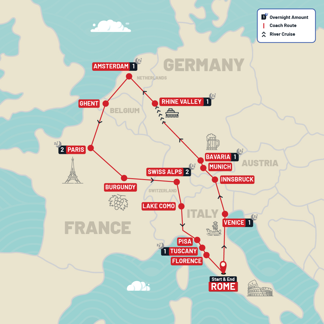 Embark on one of the most beloved European tours and see all the top attractions! The tour kicks off in Rome and explores Europe's highlights over 10 exciting days. Discover world-famous sights