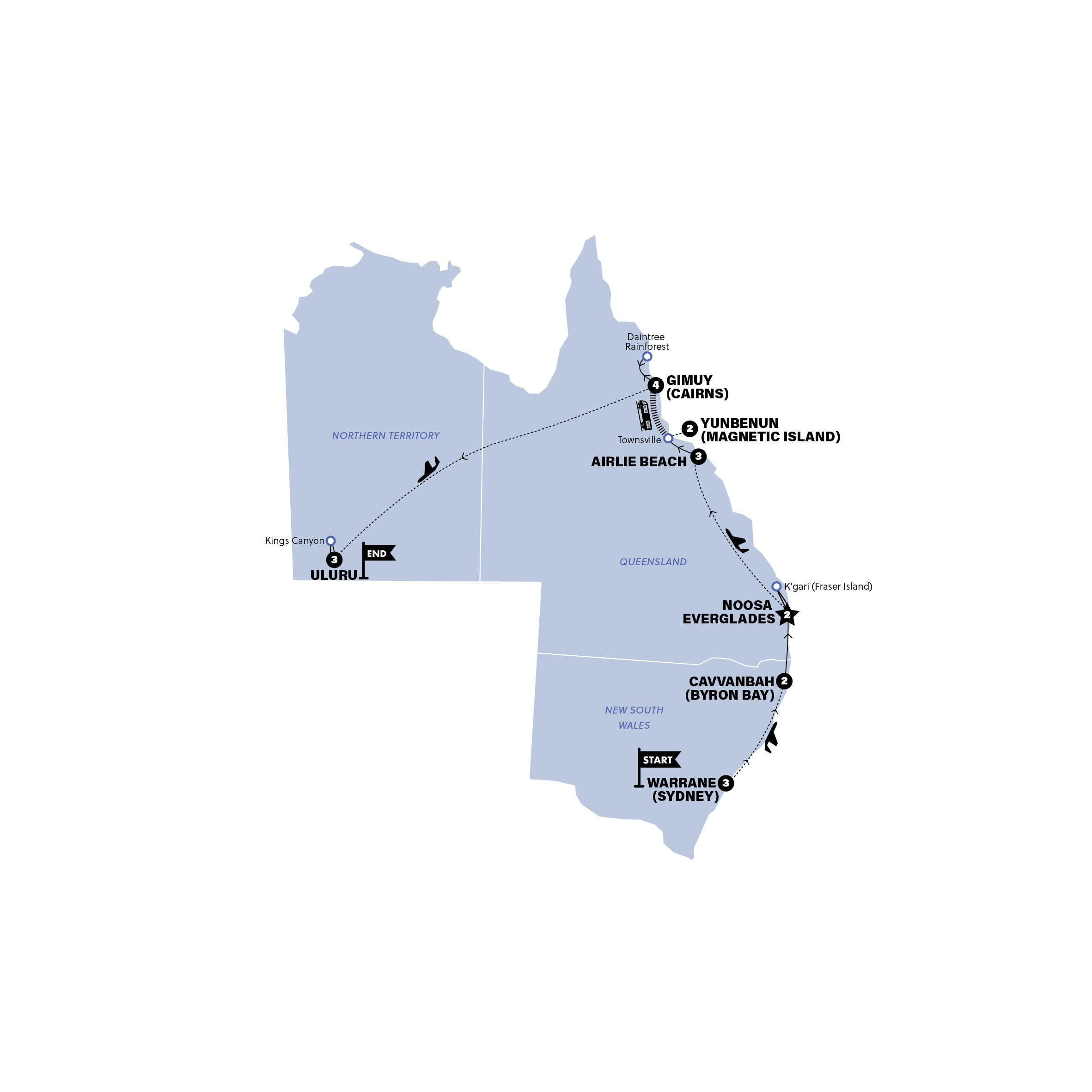 Ahh, the famous East Coast, where you can expect wildlife tours and bushwalks between beaches and sunsets. Kicking things off in Sydney, you’ll sleep at an Eco Camp in the Noosa Everglades, learn to s