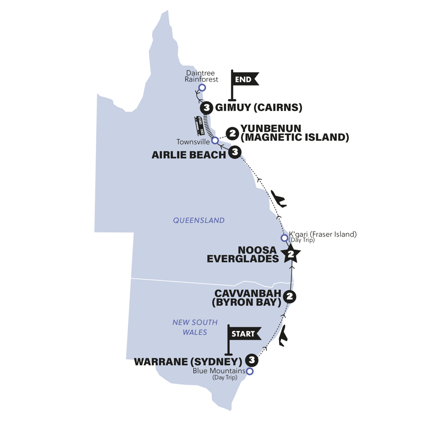 Ahh, the famous East Coast, where you can expect wildlife tours and bushwalks between beaches and sunsets. Kicking things off in Sydney, you’ll sleep at an Eco Camp in the Noosa Everglades, learn to surf at Byron Bay and gaze out over the Whitsundays from Airlie Beach. This is a one way ticket to wanting to live the Aussie lifestyle for good.