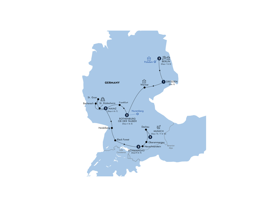 In Heidelberg, join a Local Expert to explore the cobbled Altstadt. Admire the historic buildings of Germany’s oldest university, founded in 1386, and the Gothic Church of the Holy Spirit. From the 18th-century Old Bridge, take in views of the red sandstone castle, once a symbol of the Palatinate's power. Continue to the Black Forest, famed for its folklore and craftsmanship. Here, enjoy an authentic slice of Black Forest Gateau and browse hand-carved cuckoo clocks, a tradition since the 1700s. Your day ends with a scenic drive along Lake Constance, one of Europe’s largest freshwater lakes, before arriving in storybook Schwangau, nestled at the foot of the Bavarian Alps.