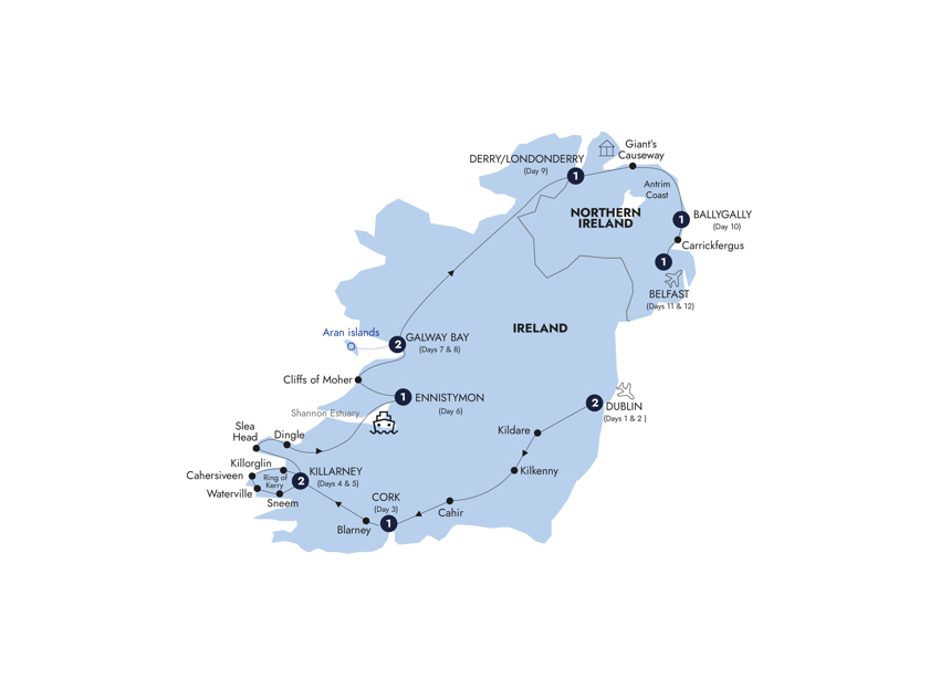 Let the luck of the Irish be with you on this 12-day guided tour across Ireland. Start the tour in Dublin, where you get up close to the Book of Kells, an ancient Gospel manuscript filled with mythical beasts and Celtic knots. In Kilkenny, visit the majestic Kilkenny Castle. A chef will share traditional Irish recipes at a farm-to-table feast in Killarney. You'll see the Ring of Kerry, a mystical, verdant peninsula dotted with seaside villages. Finally, step onto Giant's Causeway with it's basalt columns carved onto the coast by volcanic lava, or a giant's feet, if Irish myth is to be believed.