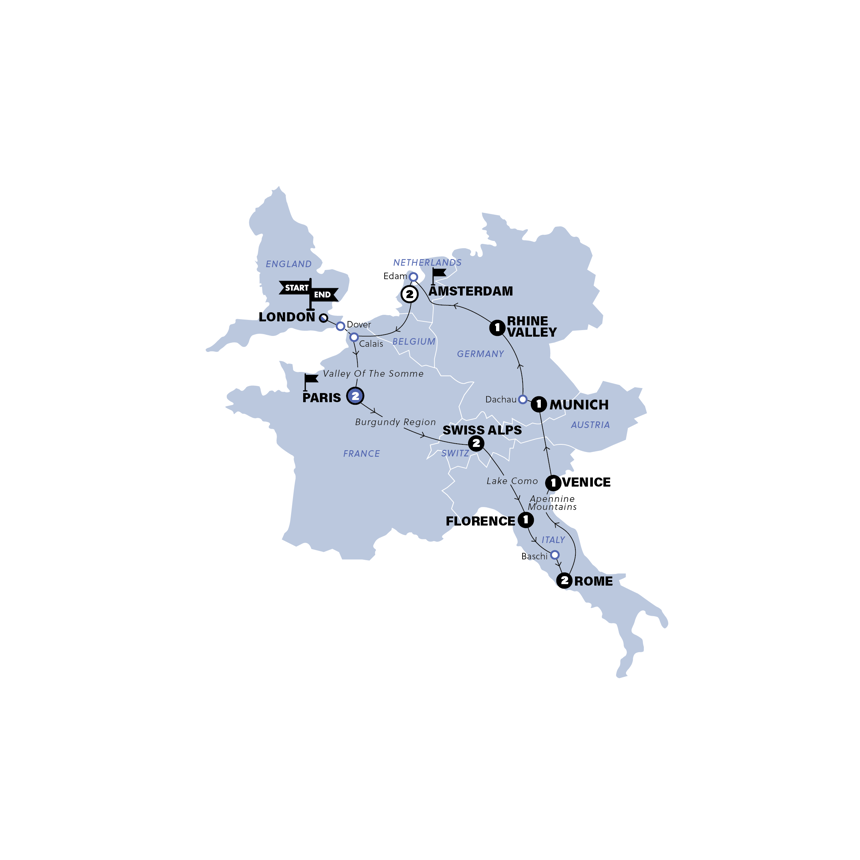 Ready for the beginning of your sweet love affair with Europe? This European Discovery tour uncovers Europe’s finest in 12 days, complete with Bavarian beer & a visit to a French perfumery. We'll discover Paris, Rome, Amsterdam, Munich, Venice & Florence, flirting with many more destinations along the way, from a traditional German beer hall to lunch at a local Italian farm (on us). You’ll get a taste for all the best bits of the continent and travel through 6 countries in one trip. By the time you get back to London you'll be completely smitten.
