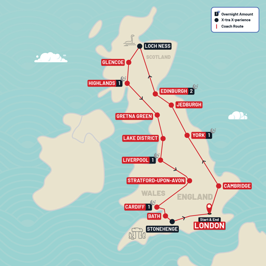 Discover the essence of England, Scotland, and Wales on this Great Britain tour. Explore the historic cities of Bath, Cambridge, York, and Edinburgh. Visit Stonehenge, Shakespeare's hometown, and embark on fascinating city tours. Take in the stunning views of the Scottish Highlands and the English Lake District. Relish local cuisine and authentic experiences, such as a traditional Sunday roast. This Great Britain tour offers a genuine British travel adventure.