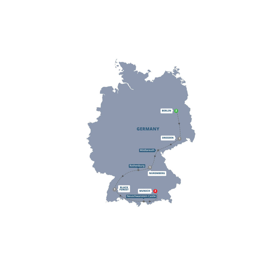 Unlock the highlights of Germany, from Berlin’s Brandenburg Gate to Nuremberg’s impressive Frauenkirche. Delve into the history of Dresden and discover divided Germany’s legacy at the open-air museum in Mödlareuth. View the fairy-tale Neuschwanstein Castle and travel through the Bavarian countryside to vibrant city of Munich.